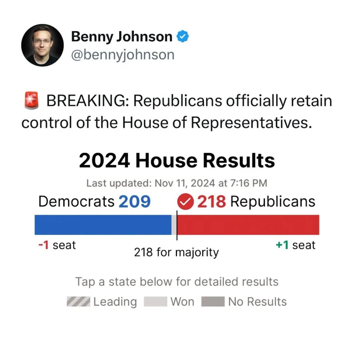 House; Also the House is now under Republican control, which is important for Trump and its Administration. With now the majority in the Senate and House, he and the Republican Party can push and implement their agenda more easily. The Republican also won the House by a Landslide, just like the Presidency and the Senate.