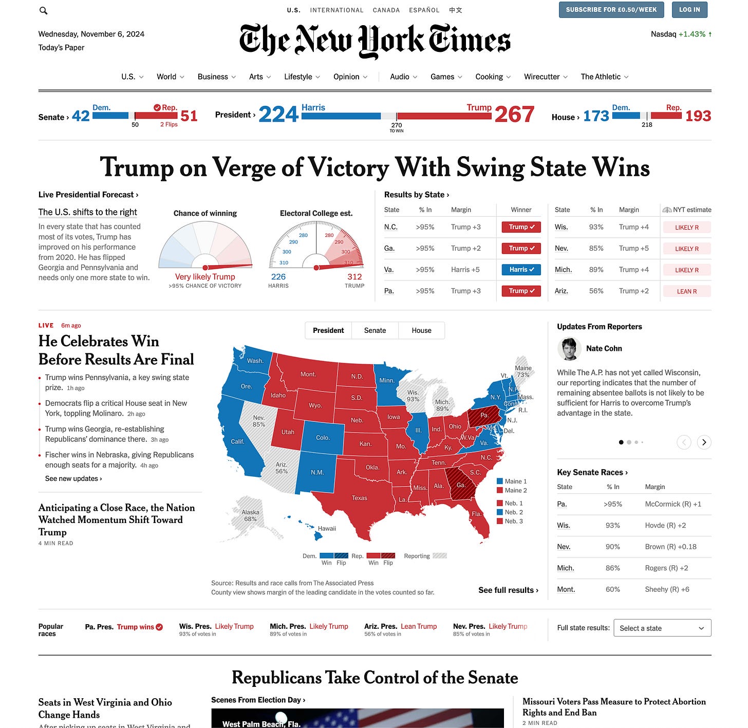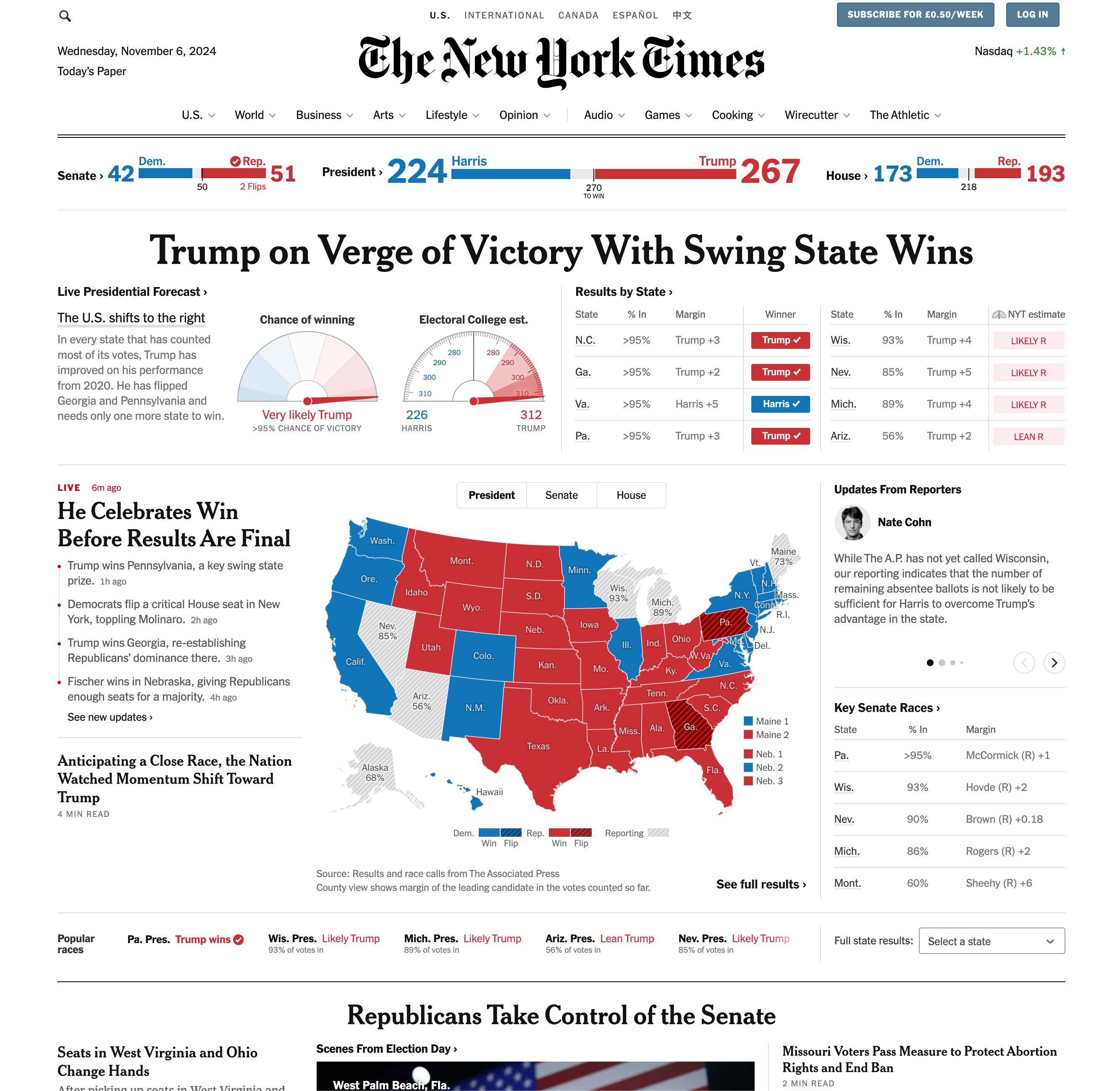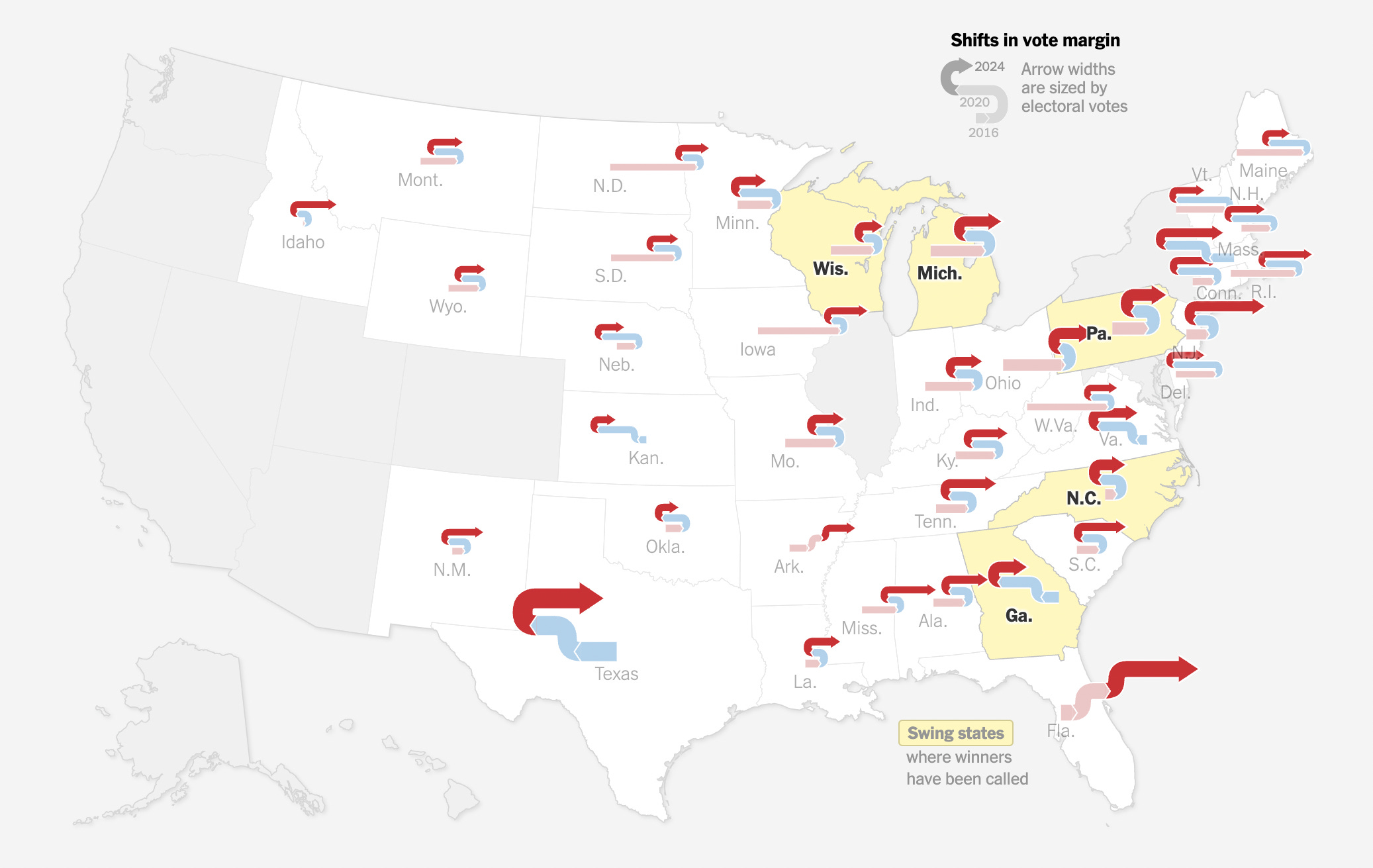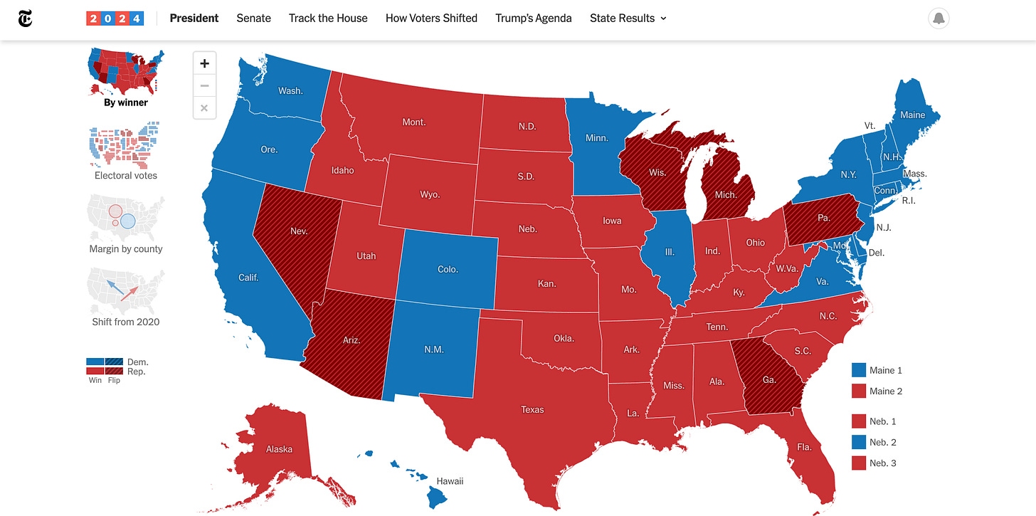 President; Trump returns to the White House, indicating an administration that pushes for changes in finance and how America relates with businesses within. He clearly won the election with a landslide win of 312 electoral votes, to 226 electoral votes. This is even a bigger win than he had against Hillary Clinton, in 2016. When you compare it to the 2020 election, the blue wall, which consists of the states like Pennsylvania, Wisconsin, Michigan, Georgia, Arizona, and Nevada, clearly flipped to his advantage, gaining trust back from the voters. It is just showing a clear and strong message; The people wanted him back in office!
