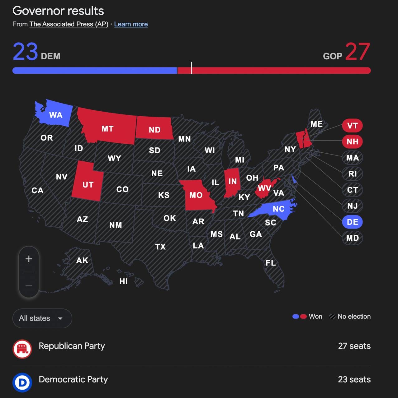 Governor; For the Governors, the Republican Party candidates won most key races, solidifying state-level control in swing states. With 27 to 23, the Republican Party also takes control of the Governor positions.