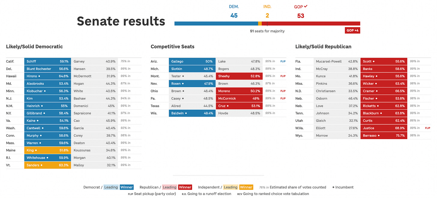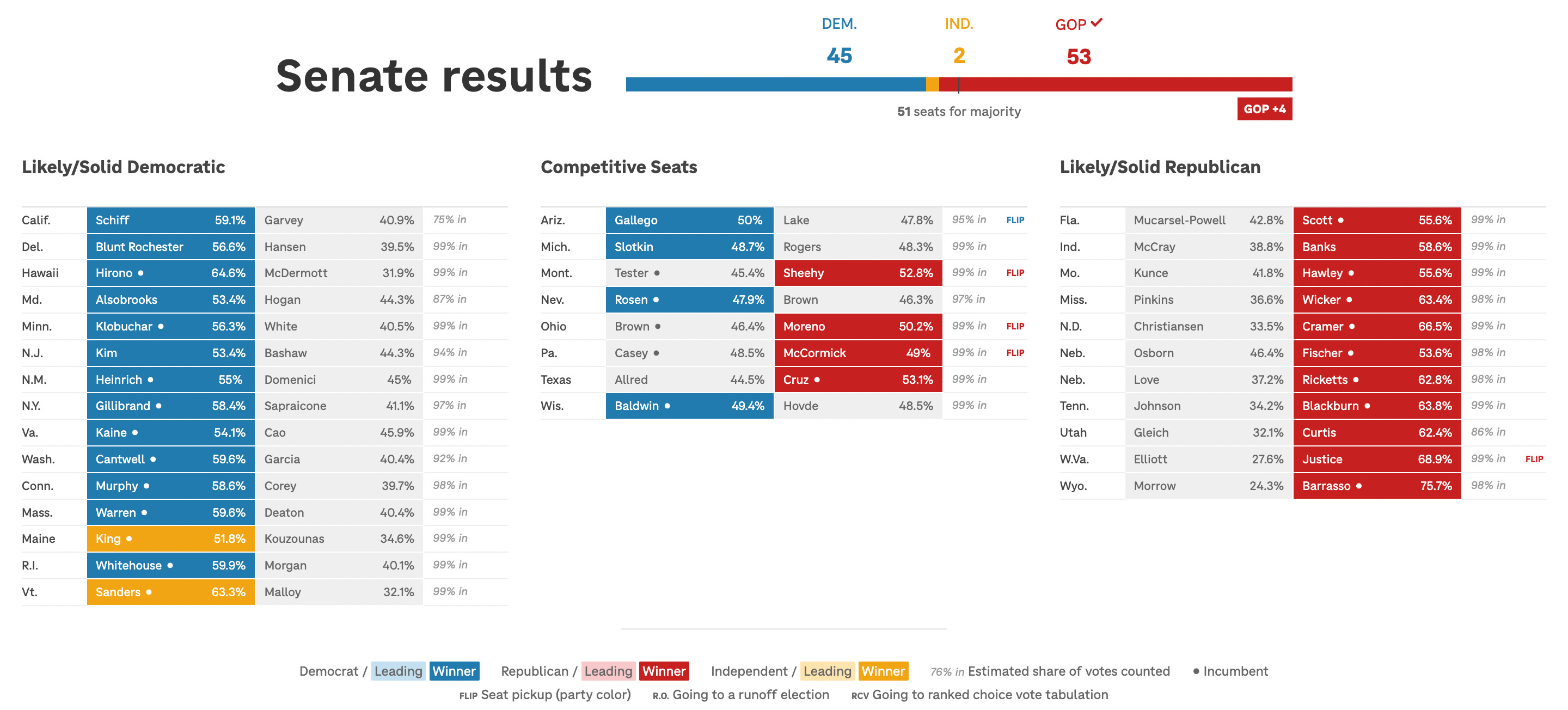 Senate; The Republican Party won the majority with 53 seats in the Senate, flipping 4 seats from the last major election. The Democratic Party lost seats, losing 4 seats in the Senate, making it only 45 seats plus 2 extra seats from two Independent Party. With the Republicans also gaining power in the Senate, they are now securing a major majority. This control in the Senate is expected to ease the passage of certain policies, laws, and will provide an advantage in judicial appointments.